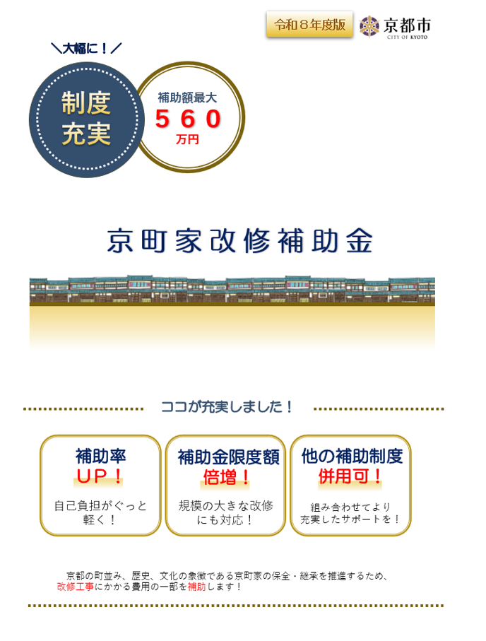 京都の町並み、歴史、文化の象徴である京町家の保全・継承を推進するため、京町家の改修工事にかかる費用の一部を補助します!