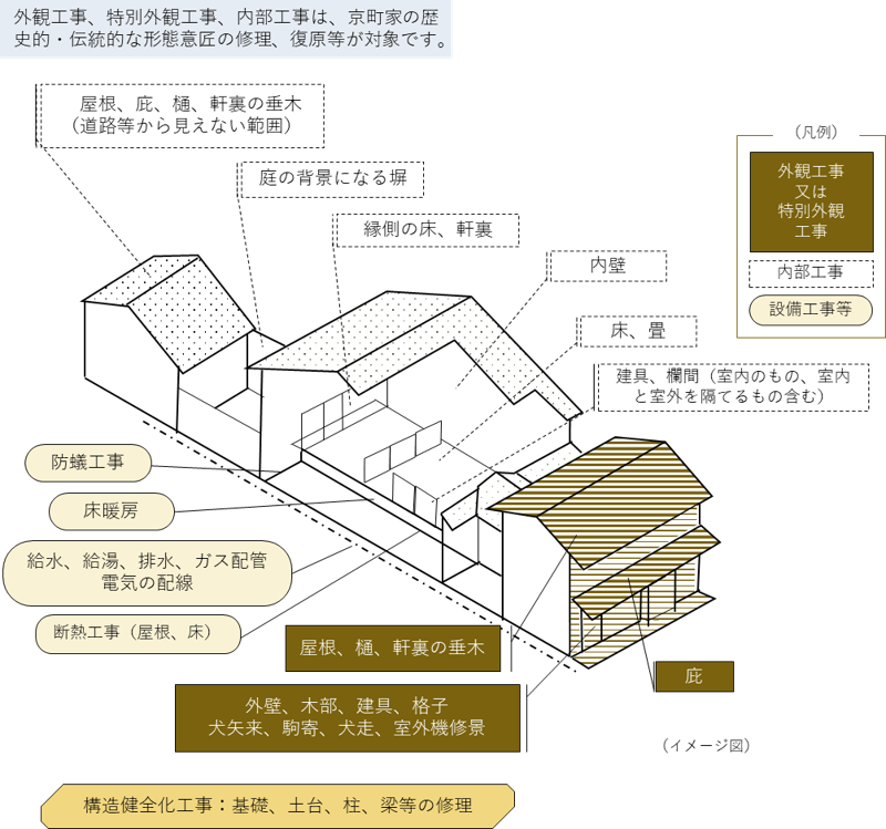 歴史的な形態又は意匠の外観要素が少ない京町家についてする外観工事であって、当該工事により京町家の形態及び意匠の模範となる外観に整備し、補助事業完了後に当該京町家を個別指定京町家に指定するために行う工事をいいます。補助事業完了後、個別指定京町家に指定されることが要件です。